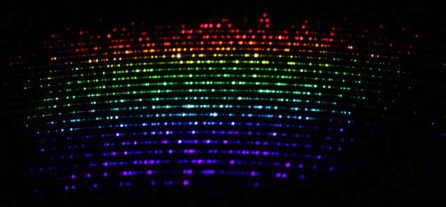It is usually done by analysing the light of a lamp whose lines are at a known position. In our case, it’s a lamp filled with a mixture of Thorium and Argon. This has been the method of choice all around the world for quite a while now, since it works very well, but the accuracy of the position of the lines depends on many parameters, including some which are difficult to determine. With the ageing of the lamp, the quality of the light it emits degrades, making it less accurate over time. Thus, astronomers have looked for new ways to find a light source that would not age, and be even more accurate than the lamp used.